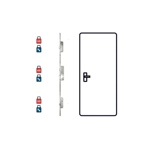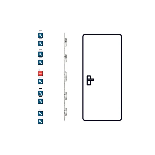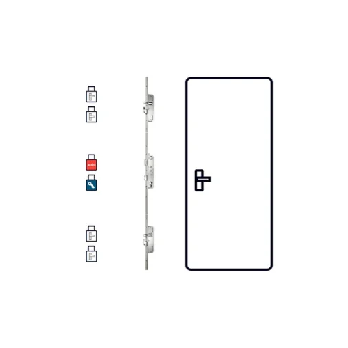 Wszystkie haki i rygle wysuwają się przez zamknięcie drzwi i uniesienie klamki do góry. Obrócenie klucza dodaje ryglowanie zasuwką głównego zamka. Otwarcie: obrócić klucz, nacisnąć klamkę w dół.