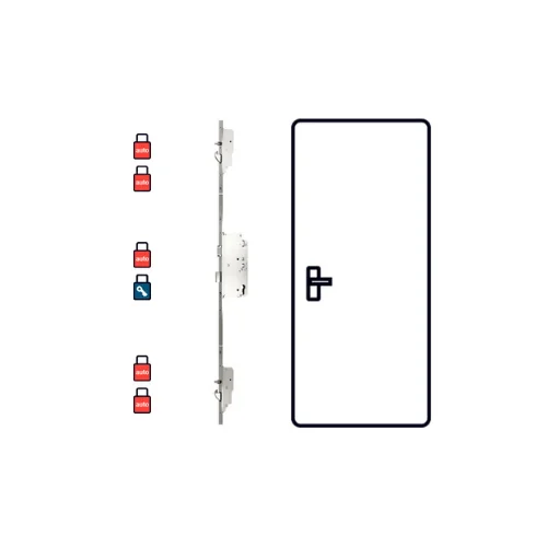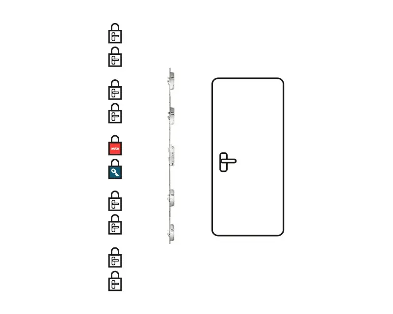 Zamknięcie automatyczne na zasuwce głównego zamka. Pełne ryglowanie: obrócenie klucza aktywuje haki i rygle w 6 punktach. Opcjonalnie: elektrozaczep, zaczep dzień/noc. Wejście od zewnątrz: naciśnięcie klamki lub klucz z pochwytem.